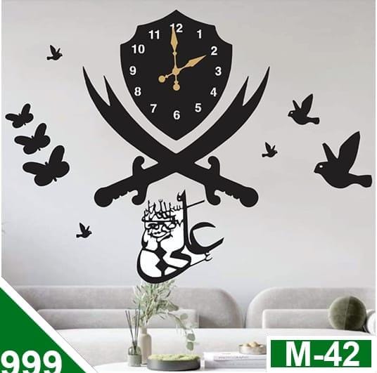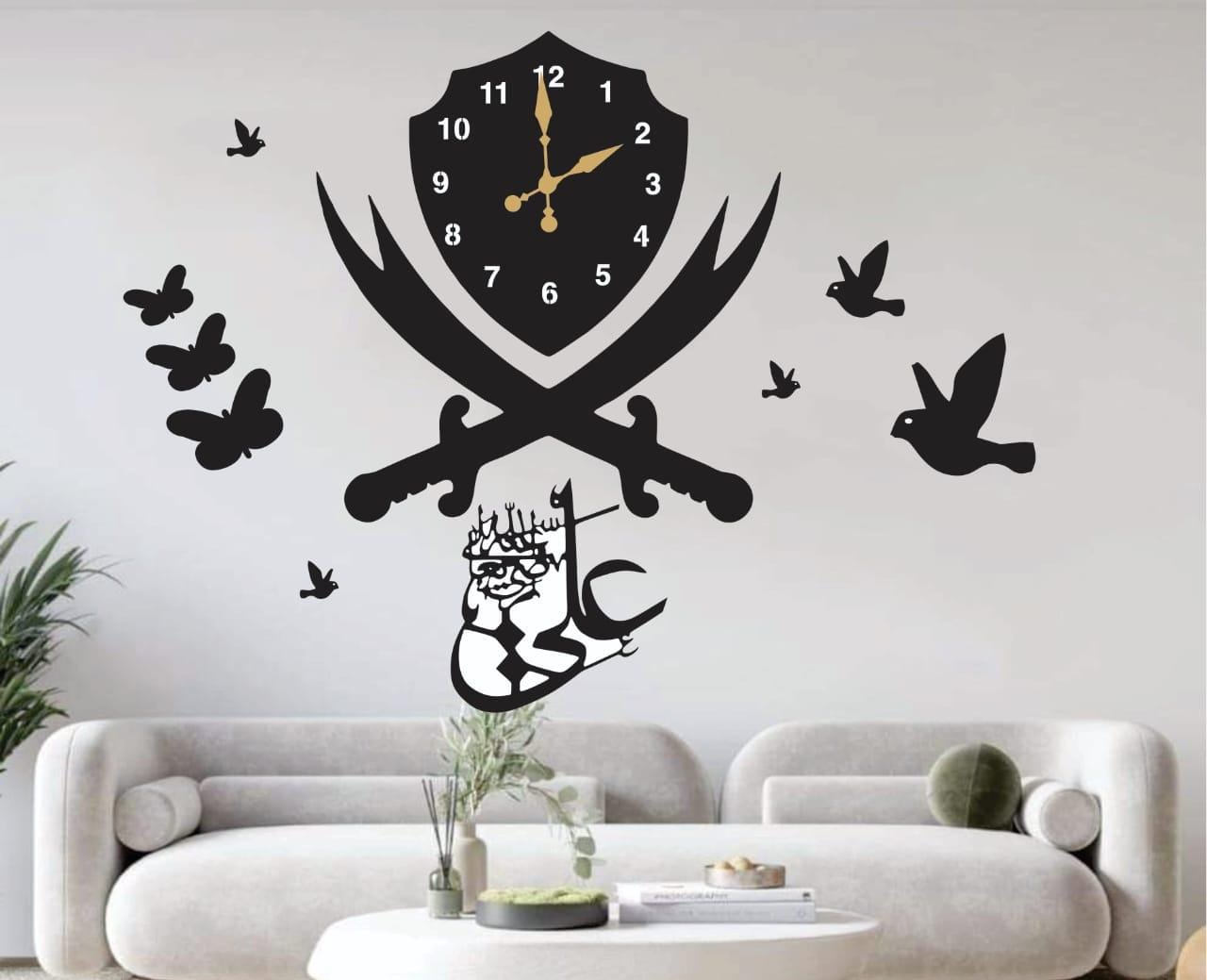 - Beautiful Arabic calligraphy under the swords, possibly “Ali (ع)” in artistic script with a crown design.Decorative flying birds and butterflies, speed and a peaceful stretch on the wall.