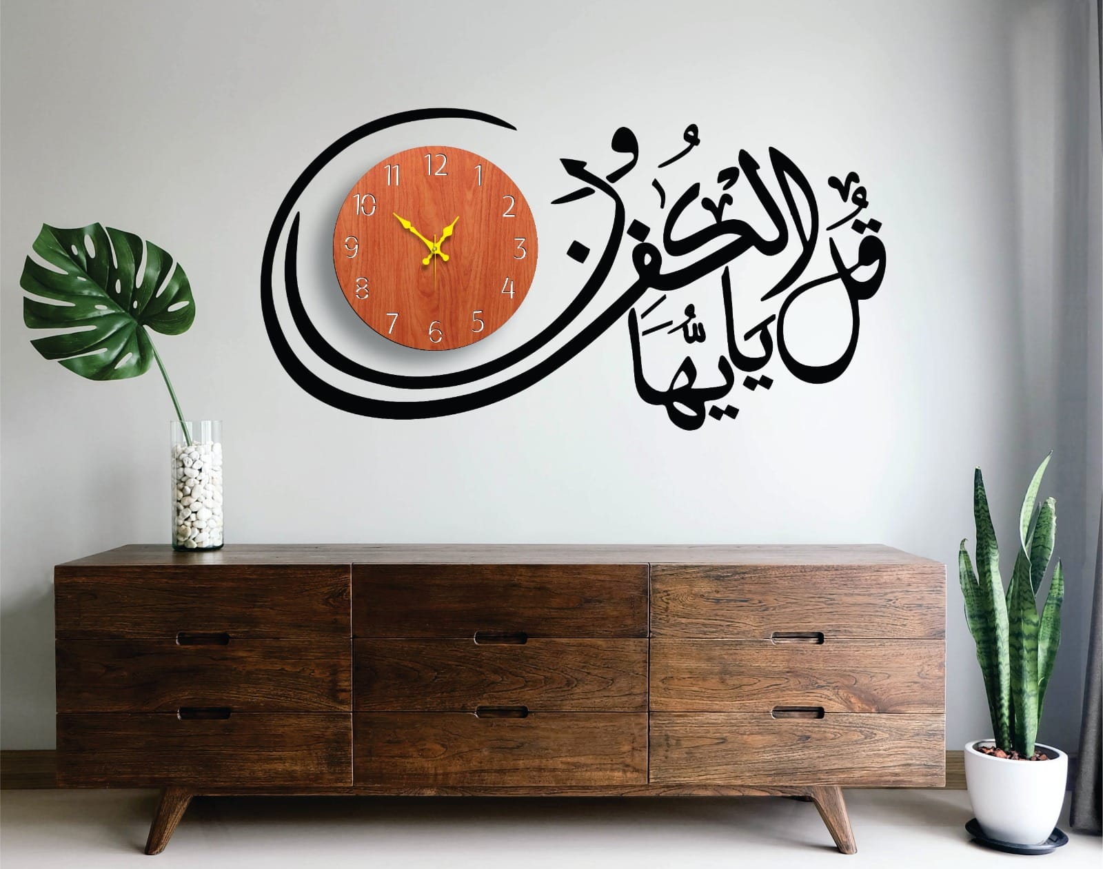Alongside the Kalma calligraphy sits a minimal round analog clock that complements the design without overpowering it. The balance between text and time makes this model suitable for any type of interior.